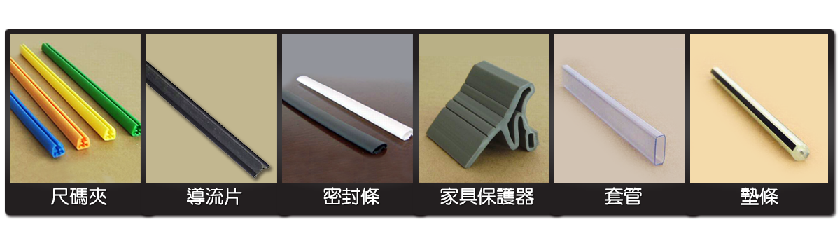 ■ 異型押出為硬質,軟質,之押出管條及各種異型,複合式押出製品或特殊規格訂製品。產品有:電路板槽、透明條、護邊條、裝飾條、膠槽、緩沖墊、異型管、滑軟燈、止水條、樑柱轉角防撞條、支柱、支架、尺碼夾、導流片、密封條、家具保護器、套管、墊條、塑框、卡槽、卡扣、包邊條、刷片、伸縮縫、伸縮止水條、止水帶、三角塞、衣架防滑墊、滑軌、燈管...等。